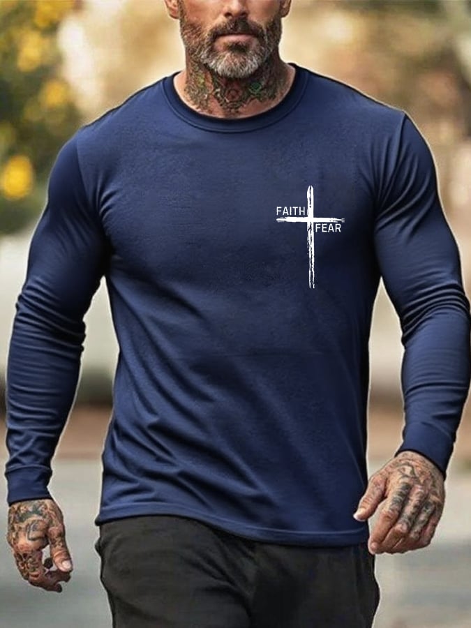 Men's Retro Faith Cross "Faith Over Fear" Print Crew Neck T-Shirt